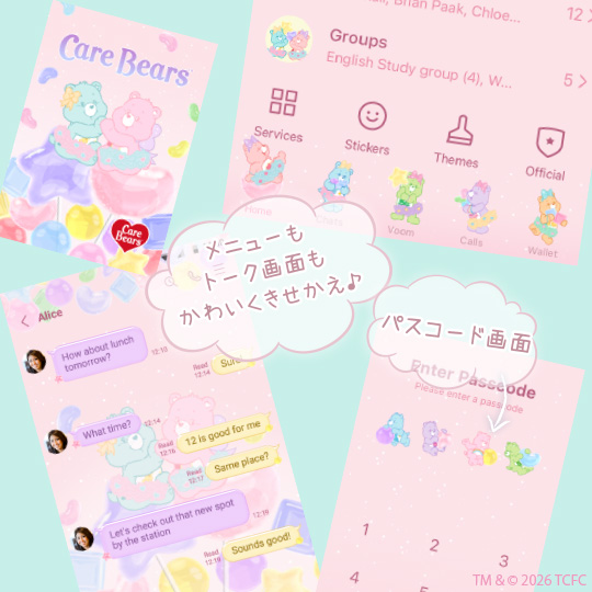 トーク画面やメニュー画面が一気にかわいくなって、スマホを開くたびにケアベア™たちがあなたを癒してくれますよ♪