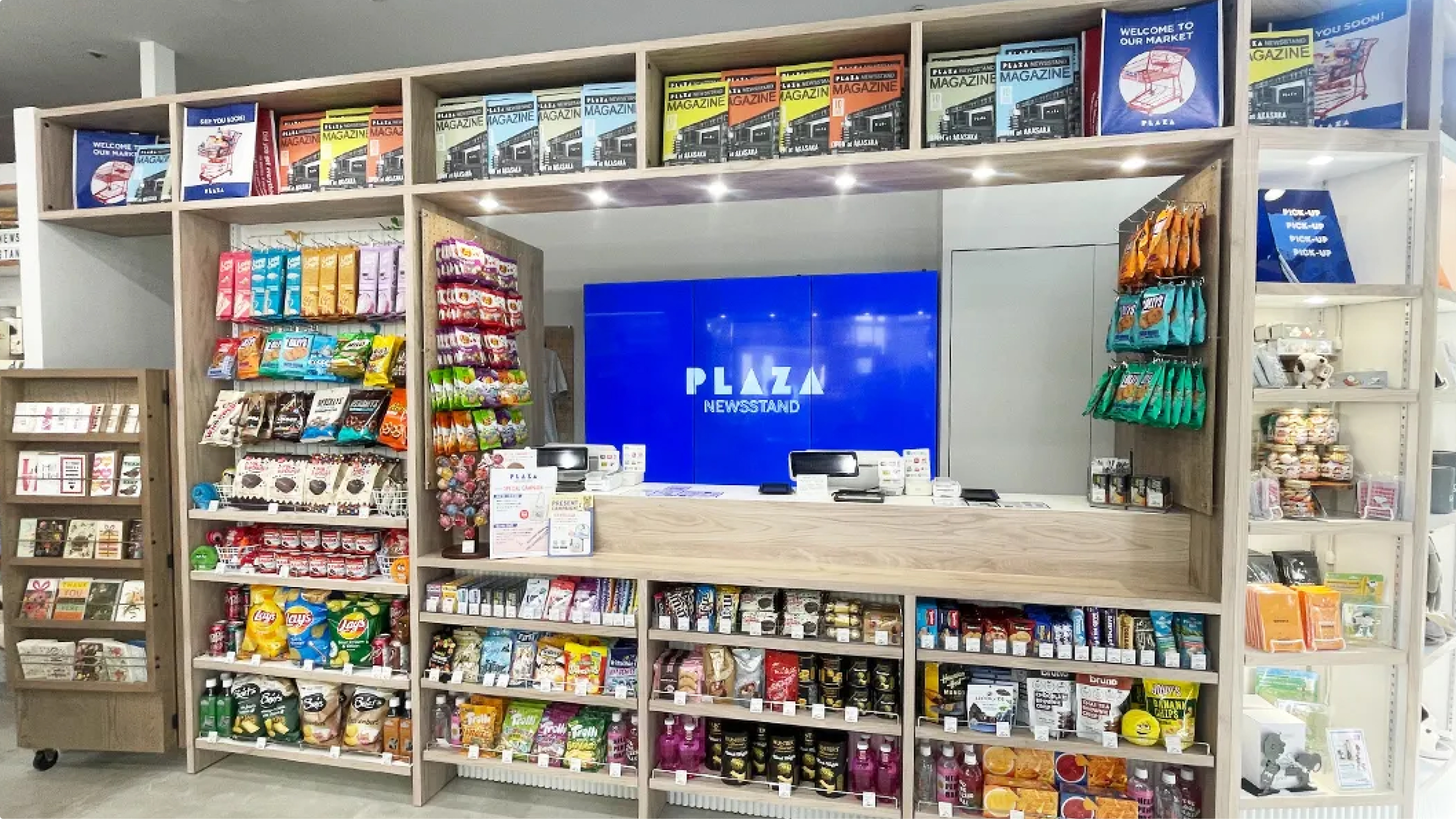 村岡:ニューススタンドというと店主の周りに商品が陳列されている光景を思い浮かべる方も多いですし、レジ周りはニューススタンドというテーマを体現する場でもありました。当初は店舗中央にレジを設置することも検討したのですが、空間の効率を考えていくなかでレジを奥に置きつつ、手前にはコルトンを設置してPLAZAのプライベートブランドの「PLAZA BASICS」を展開するなど、レジだけでなく店内全体で新しい印象を与えていくことを意識していました。