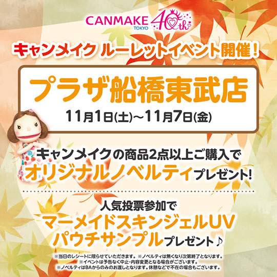 PLAZA 船橋東武店では11/1(土)~11/7(金)の期間、「CANMAKE(キャンメイク)」のルーレットイベントを開催いたします。
