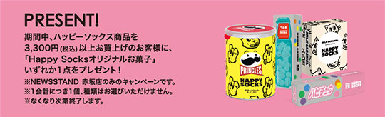 期間中、ハッピーソックス商品を3,300円(税込)以上お買い上げのお客様に「Happy Socksオリジナルお菓子」いずれか1点をプレゼント!