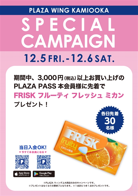 期間中、3,000円(税込)以上お買い上げのPLAZA PASS 本会員様(各日先着30名様)に「FRISK フルーティ フレッシュ ミカン」をプレゼント!