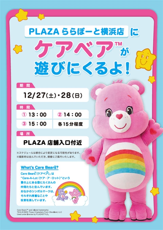 PLAZA ららぽーと横浜店では12/27(土)・12/28(日)の2日間、大人気の「ケアベア™」が遊びに来てくれます!お店に来たケアベア™と一緒に写真も撮れますよ♪