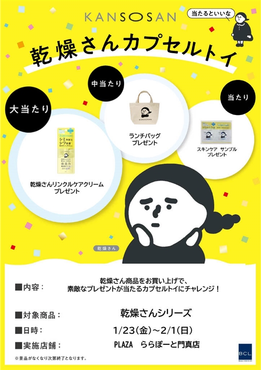 PLAZA ららぽーと門真店では1/23(金)~2/1(日)の期間、「乾燥さん」のカプセルトイイベントを開催いたします!