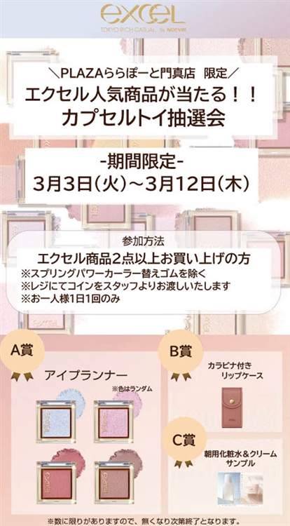 PLAZA ららぽーと門真店では3/3(火)~3/12(木)の期間、「excel(エクセル)」のカプセルトイイベントを開催いたします!