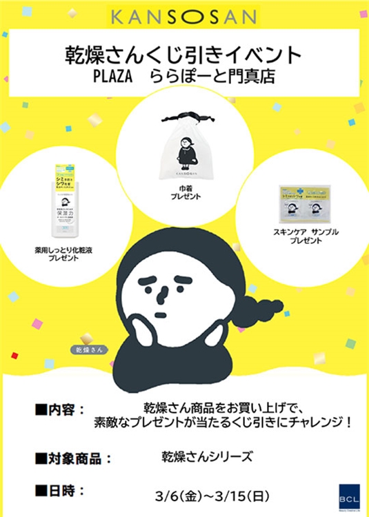 PLAZA ららぽーと門真店では3/6(金)~3/15(日)の期間、「乾燥さん」のくじ引きイベントを開催いたします!