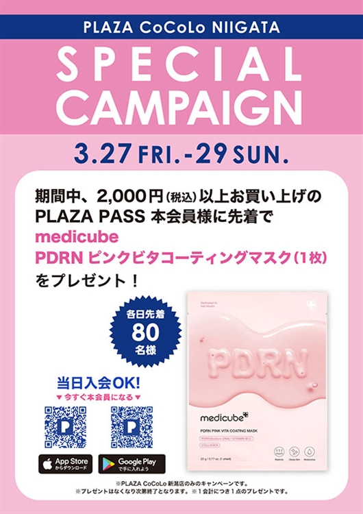 期間中、2,000円(税込)以上お買い上げのPLAZA PASS 本会員様(各日先着80名様)に「medicube PDRN ピンクビタコーディングマスク(1枚)」をプレゼント!