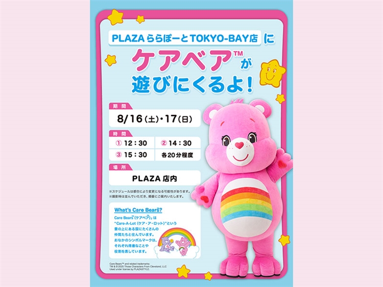 店舗情報はこちら 関東 千葉 PLAZA ららぽーとTOKYO-BAY店 2026.01.07 1/11(日)・1/12(月・祝)の2日間「ケアベア™」が遊びに来るよ! 関東 千葉 PLAZA ららぽーとTOKYO-BAY店 2025.08.13 PLAZA ららぽーとTOKYO-BAY店に「ケアベア™」が遊びに来るよ!8/16(土)・8/17(日)の2日間開催