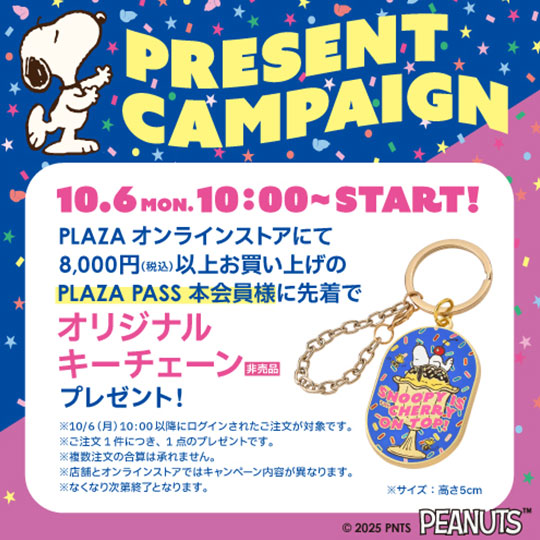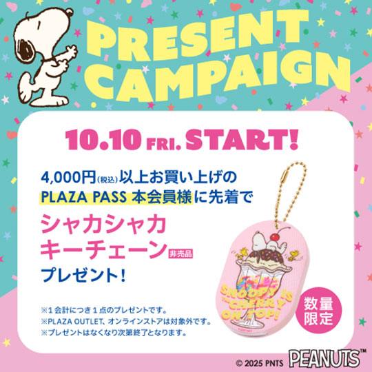 10/10(金)から、全国のPLAZA・MINiPLAにて4,000円(税込)以上お買い上げのPLAZA PASS 本会員様に先着で「シャカシャカキーチェーン」(非売品)をプレゼントいたします。