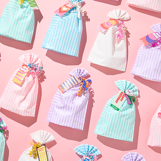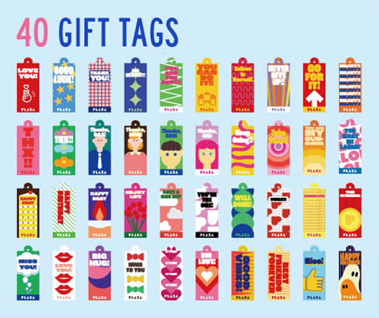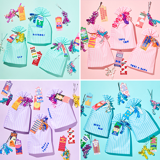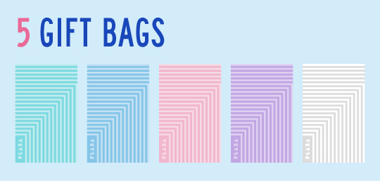 バッグタイプは、通常PLAZAで無料提供しているギフトバッグ(1カラー)とカールリボン(2カラー)を含む、[5カラーのギフトバッグ/12種のカールリボン/約40デザインのギフトタグ]からお選びいただけます。