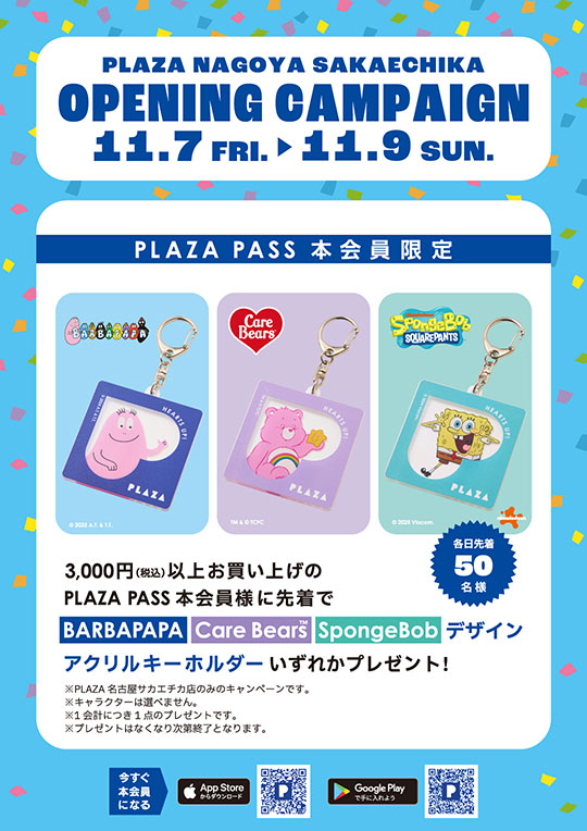 11/7(金)~11/9(日)の期間、3,000円(税込)以上お買い上げのPLAZA PASS 本会員様(各日先着50名様)に「BARBAPAPA/Care Bears™/SpongeBob デザイン アクリルキーホルダー(非売品)」をプレゼントいたします。