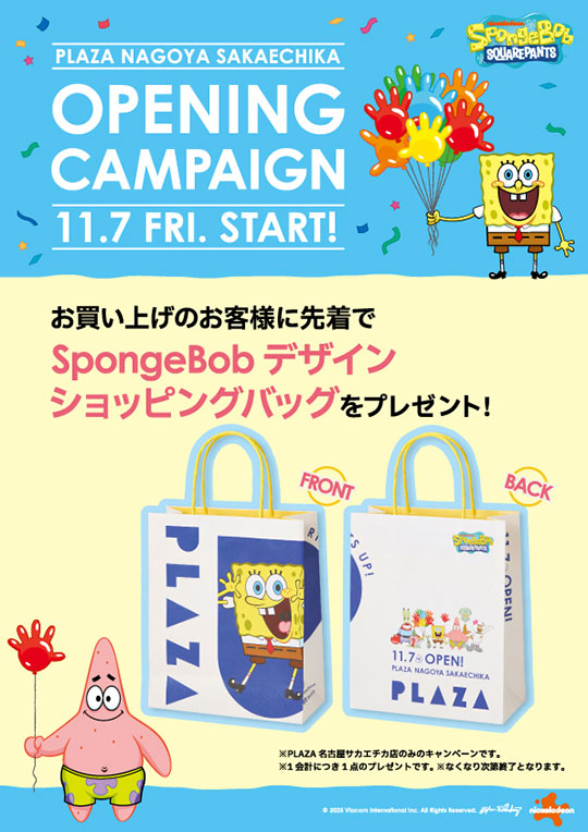 11/7(金)からお買い上げのお客様に先着で「SpongeBob デザイン ショッピングバッグ」をプレゼントいたします。