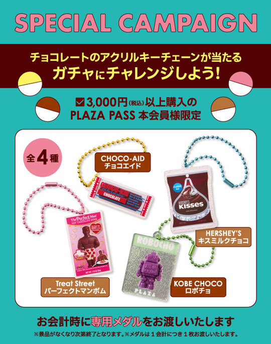 ①PLAZAでお買い物をしてガチャに挑戦!人気チョコレートのアクリルキーホルダーが当たる♪