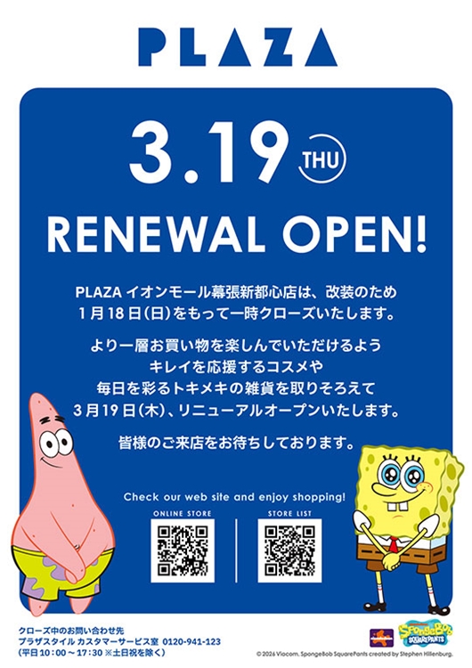 PLAZA イオンモール幕張新都心店は改装のため、2026年1月18日(日)を持って一時クローズし、3月19日(木)にリニューアルオープンいたします!