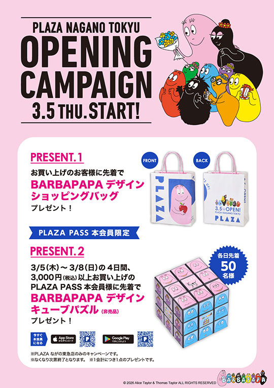 3/5(木)~3/8(日)の期間、3,000円(税込)以上お買い上げのPLAZA PASS 本会員様(各日先着50名様)に「BARBAPAPA デザイン キューブパズル(非売品)」をプレゼントいたします。