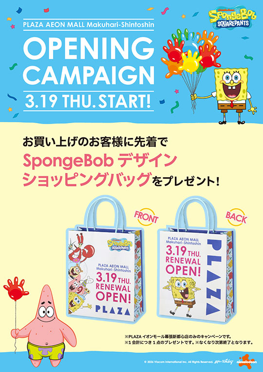 3/19(木)からお買い上げのお客様に先着で「SpongeBob デザイン ショッピングバッグ」をプレゼントいたします。
