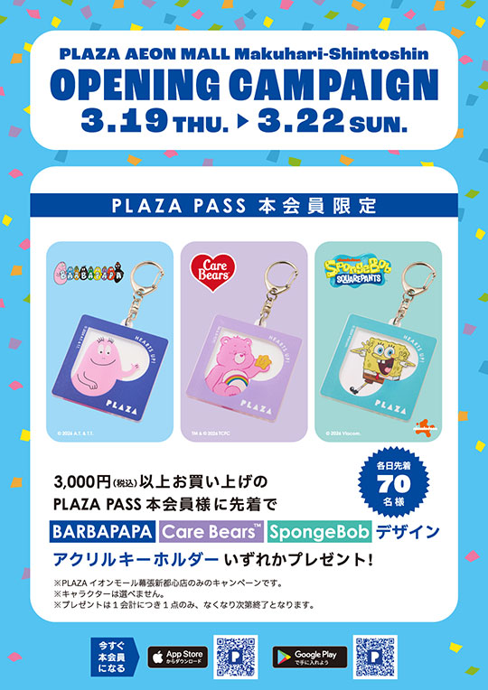 3/19(木)~3/22(日)の期間、3,000円(税込)以上お買い上げのPLAZA PASS 本会員様(各日先着70名様)に「BARBAPAPA/Care Bears™/SpongeBob デザイン アクリルキーホルダー(非売品)」をプレゼントいたします。