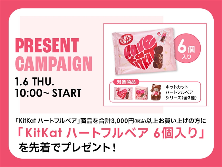 【オンラインストア】KitKat ハートフルベアー シリーズを合計3,000円(税込)以上お買い上げでプレゼントキャンペーン実施中!