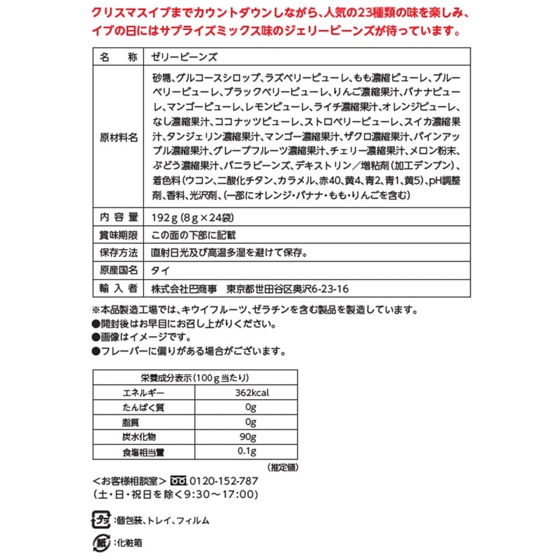 カラフルなジェリーベリーと一緒にクリスマスまでカウントダウン! 12月1日から24日のイヴまでの日付が記された、カウントダウンカレンダーです。ジェリービーンズの人気の23種類の味と、イブの日にはサプライズミックス味を楽しめます。