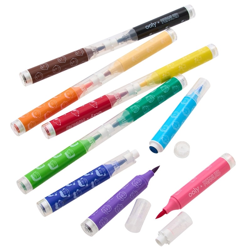 トラディショナルでお洒落なアメリカの文房具の「OOLY(ウーリー)」とPEANUTSのコラボアイテム。12本の鮮やかなカラーマーカーに、キャラクターのスタンプが付いたペンセットです。
