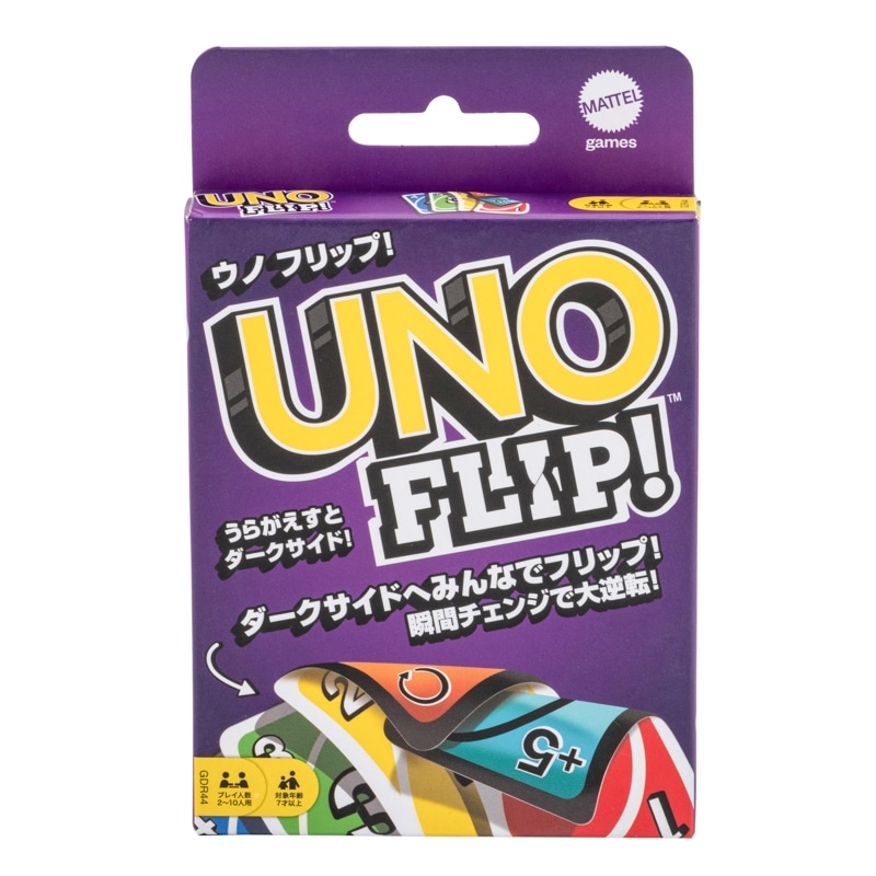 特別ルールで一層盛り上がるUNO(ウノ)フリップです。基本の遊び方は普通のウノと同じですが、カードに表と裏があり、ライトサイドでゲームを開始して、フリップカードが出たら全員でカードを裏返してダークサイドにチェンジします。ダークサイドはカードの色と記号カードの意味が変わるので大逆転の可能性も。普通のウノでは満足できない方におすすめです。