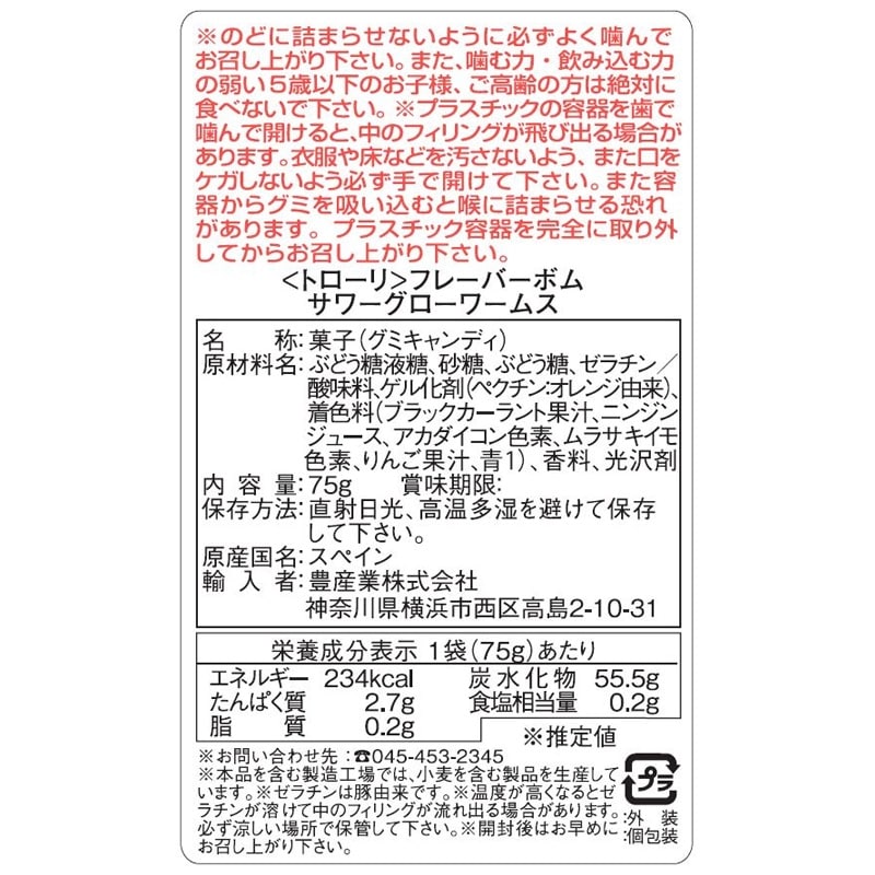 また容 器からグミを吸い込むと喉に詰まらせる恐れ があります。 プラスチック容器を完全に取り外 してからお召し上がり下さい。