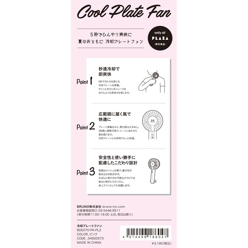 PLAZA限定!「BRUNO(ブルーノ)」の冷却プレート搭載のハンディファンにピンクカラーが登場!スイッチオンから5秒で、キリっと冷えた缶ジュースを当てたような爽快さを感じられます。プレート搭載ファンながら、ファンの開口部を大きめにすることで広範囲に風をお届け。3段階の風量調整が可能で、冷却プレートとの併用でもっと快適に。安全性に配慮し、背面はメッシュ仕様。髪の毛の巻き込みを防ぎます。かばんに取り付けできるカラビナは後ろに倒すとスタンドになり、卓上ファンとしても活躍します。