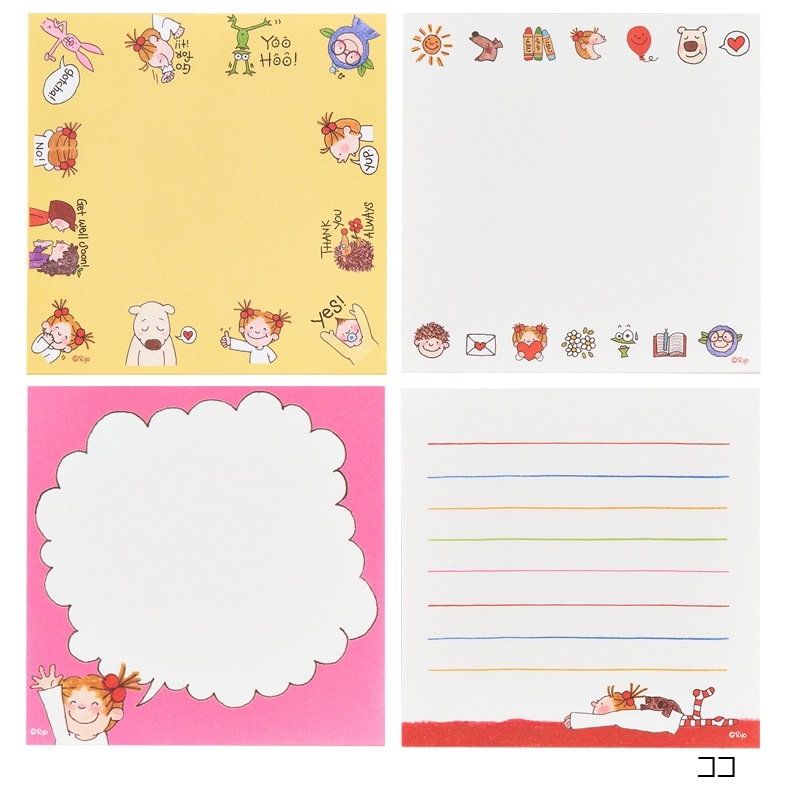 中面に4柄のメモが120枚セットされたCOCOちゃんのスクエアメモ。中面は無地や罫線、方眼どがあるので書きたい内容に合わせて選べます。絵本の世界観が表現された、キュートなデザインです。