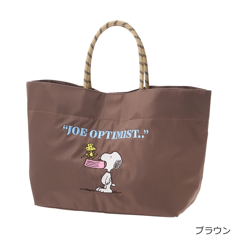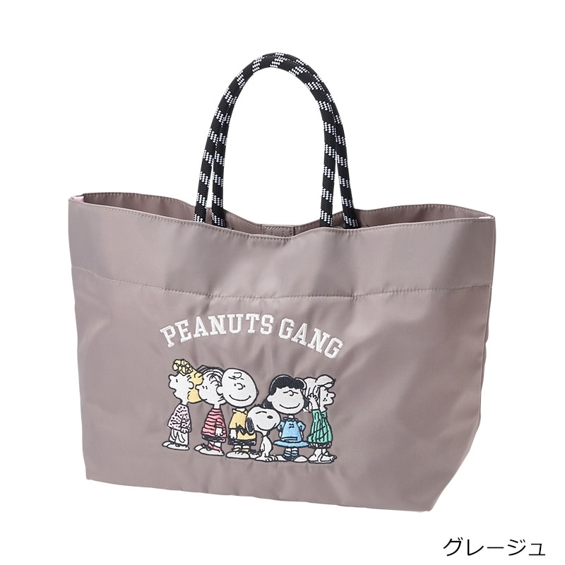 PLAZA・MINiPLA限定!アウトドアロープのようなハンドルがアクセントになったトートバッグです。フロントのスヌーピーや仲間たちの刺しゅうがキュート。大きめサイズでマチも広く、収納力抜群です。ナイロン素材を使用しているので軽く、汚れにくいのも嬉しいポイント。開口部はマグネットで閉じることができる仕様に。