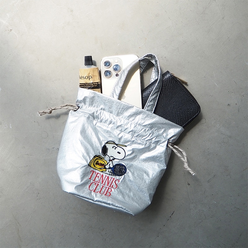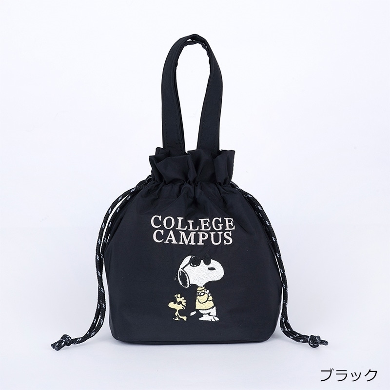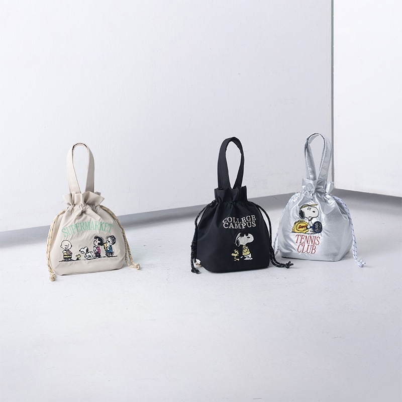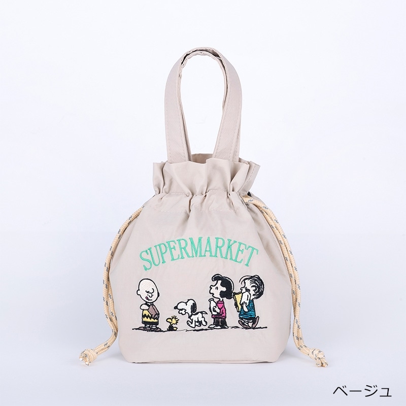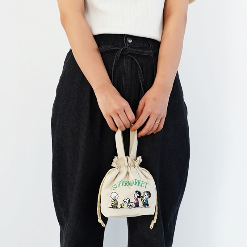 かわいいPEANUTSのキャラクター刺繍がデザインされた簡易保冷バッグです。入り口をキュッと絞れる、使いやすい巾着タイプ。おにぎりや溶けやすいお菓子、保冷剤などのちょっとしたものを持ち運ぶのに便利なサイズです。