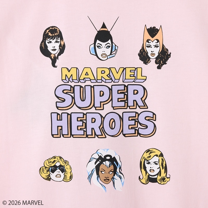 PLAZA限定!『MARVEL(マーベル)』の世界を彩る最強の女性ヒーローたちが集結!フロントはロゴのみのシンプルデザイン。バックには凛とした強さと美しさを兼ね備えた彼女たちのフェイスアートを配置しました。アメコミ特有のタッチと色使いが、ピンクに映えるデザイン。ゆったりめのシルエットでラフに着こなせます。
