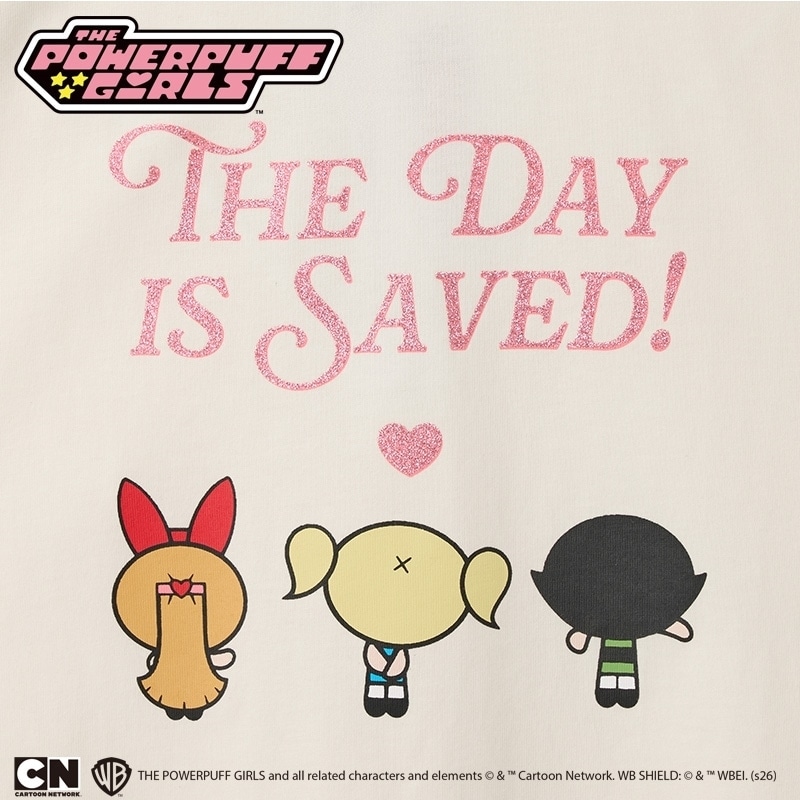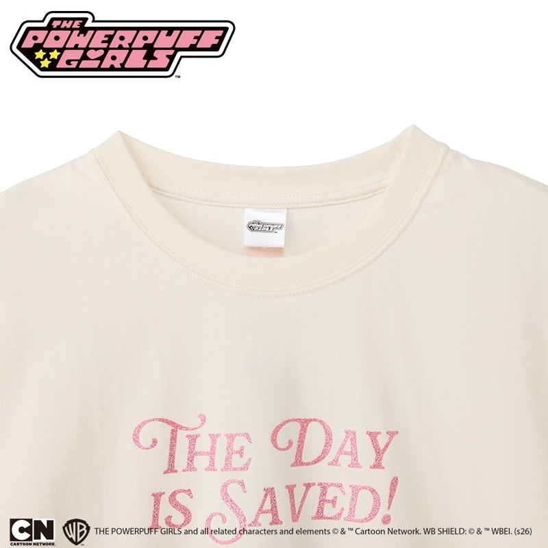 PLAZA限定!大人気アニメ『THE POWERPUFF GIRLS(パワーパフ ガールズ)』から、着るだけで元気になれそうなTシャツが登場。フロントにはブロッサム、バブルス、バターカップの3人が並んだ後ろ姿を配置。その上には「THE DAY IS SAVED!(今日も街の平和は守られた!)」とうお決まりのフレーズを、キラキラのラメでプリントしました。甘さのあるバニラホワイトカラーで、やさしい印象の着こなしが楽しめます。