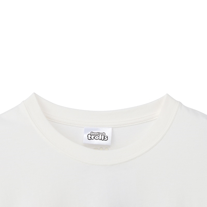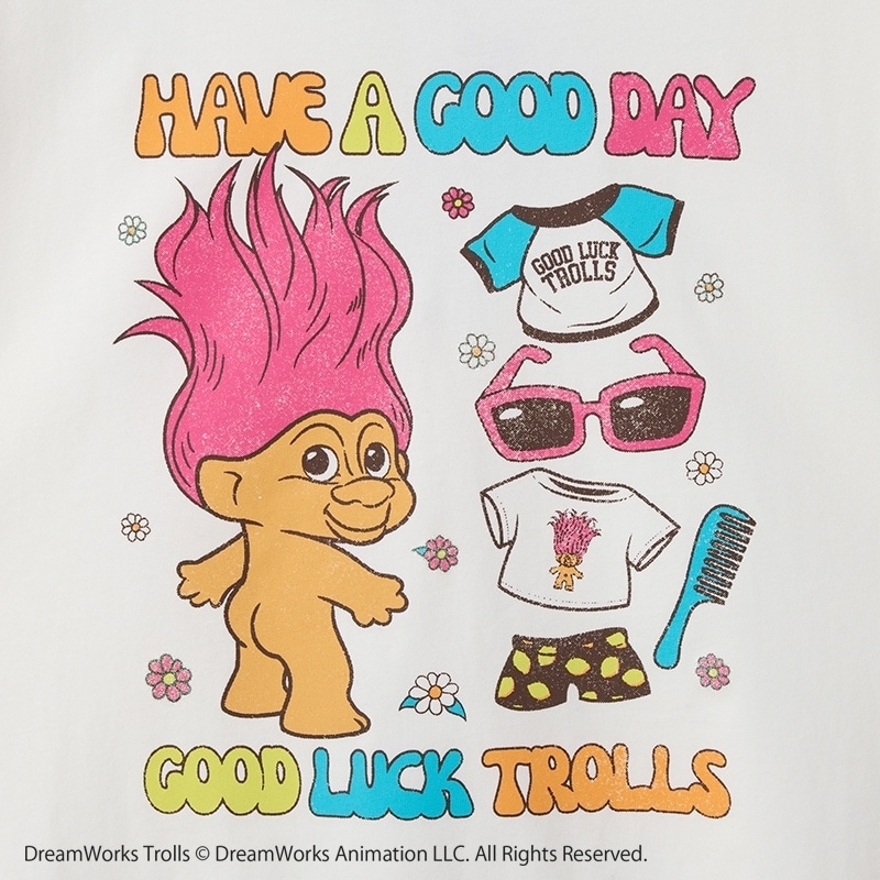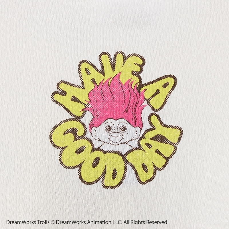 PLAZA限定!北欧の伝承から生まれたラッキーチャーム、「TROLLS(トロールズ)」を主役にした遊び心あふれる1枚。フロントには、逆立った鮮やかなピンクヘアがトレードマークのトロールと、サングラスやTシャツなどの着せ替えアイテムをデザイン。「HAVE A GOOD DAY」「GOOD LUCK TROLLS」のメッセージが、気持ちをハッピーにしてくれます。首後ろにもトロールのワンポイント入り。