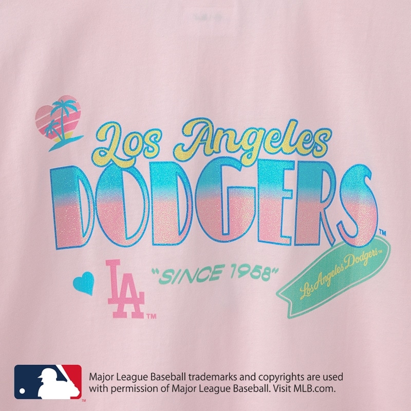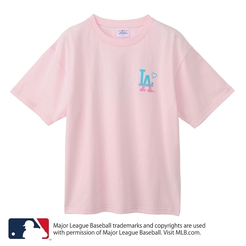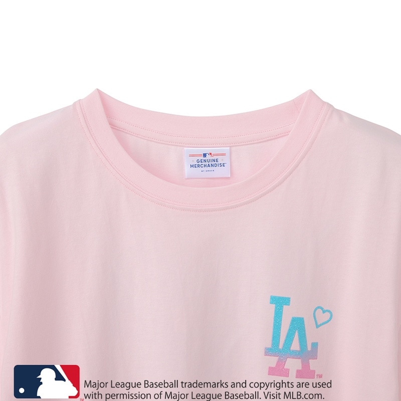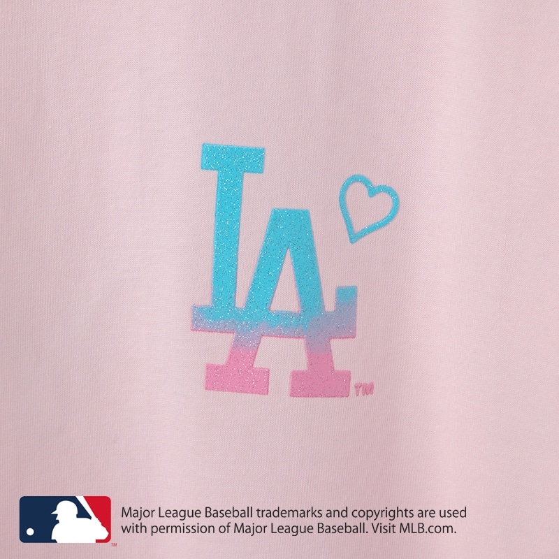 PLAZA限定!淡いピンクのボディに、グラデーションロゴが映える「ロサンゼルス・ドジャース」Tシャツが登場。フロントは胸元にハートを添えた「LA」ロゴのワンポイント、バックにはパームツリーのアートを組み合わせた西海岸ムード満載のデザイン。ぷっくり&キラキララメの部分使いで、気分をアゲてくれるハッピーテイストに仕上げました。