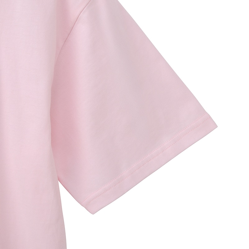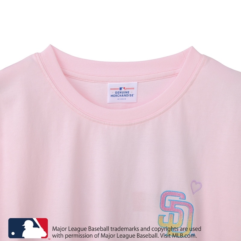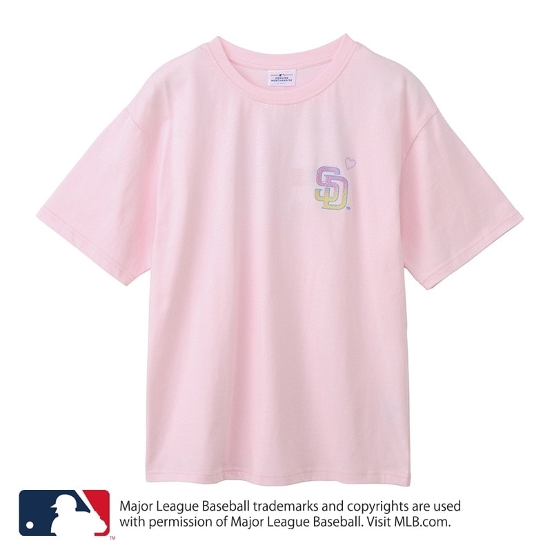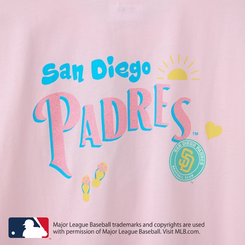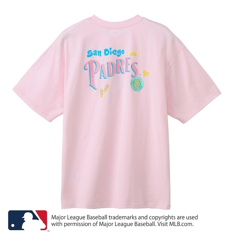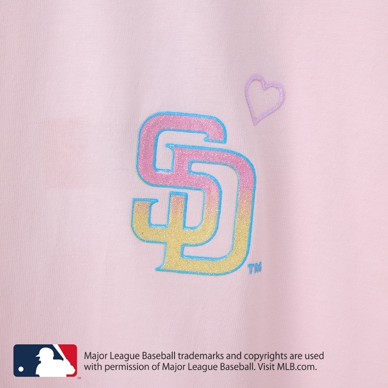 PLAZA限定!ライトピンクに、サンディエゴの太陽を思わせる明るい配色が魅力。フロントは胸元にハートを添えた「サンディエゴ・パドレス」のチームロゴをオン。バックには輝く太陽やサンダルのグラフィックをあしらい、ハッピーなリゾート感を表現しました。キラキララメを散りばめたレジャーやリゾートシーンにもぴったりな1枚です。