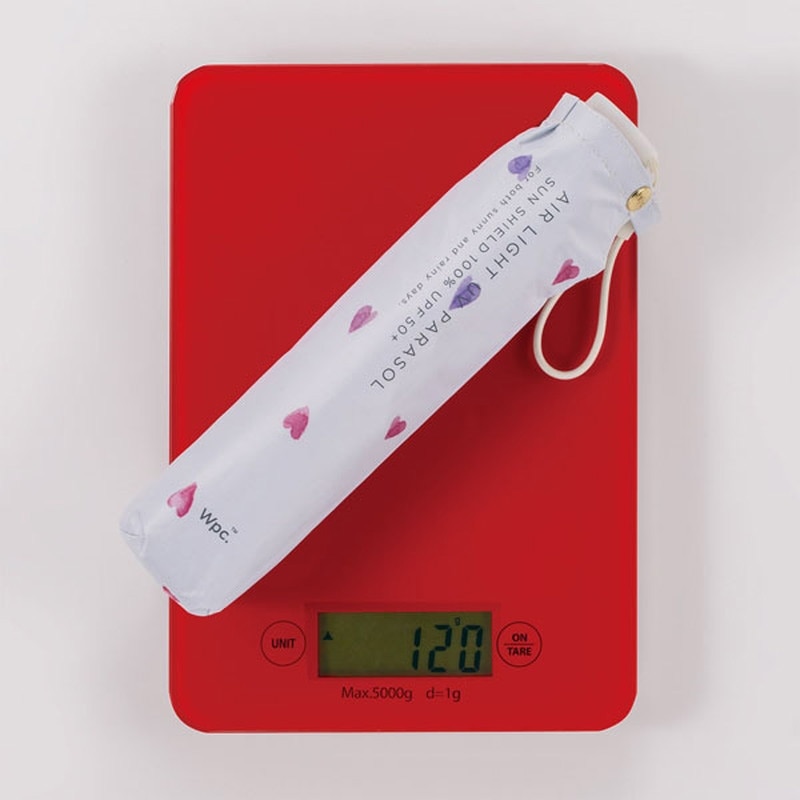 完全遮光生地の超軽量日傘!重さ125gの超軽量タイプで、持ち歩きやすい軽さの「Wpc.」の折りたたみ日傘です。水彩ハートのデザインは甘すぎず、様々なファッションに合わせやすいデザイン。UPF50+の完全遮光生地を使用し、遮熱効果もあるため、夏の熱中症対策にもおすすめです。