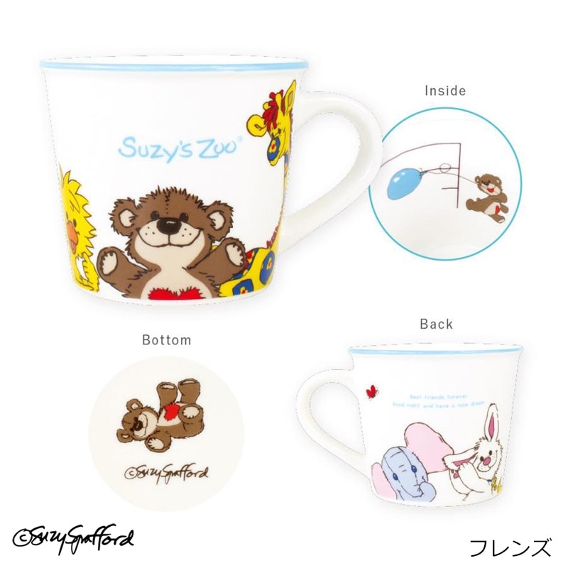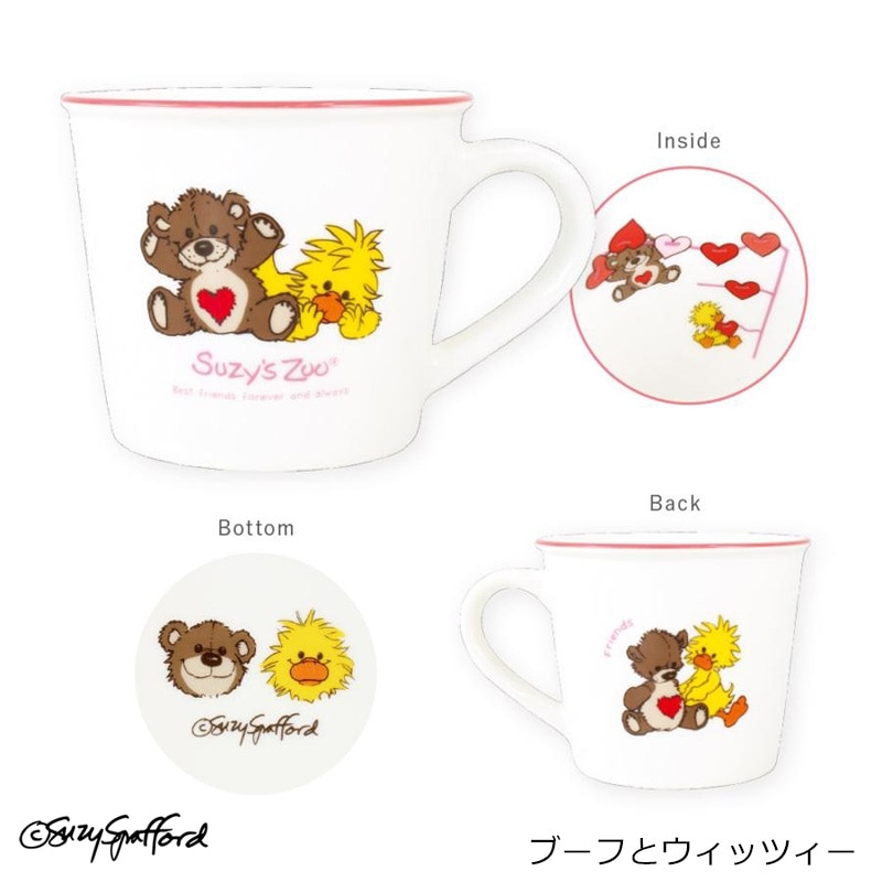 世界中で55年以上愛されているキャラクター、アヒルのウィッツィーとぬいぐるみのお友達のかわいらしい世界観が魅力の「Suzy's Zoo(スージー・ズー)」。内側にかわいいメジャー風デザインが施されたメジャーマグです。裏側と底面デザインがそれぞれ異なるのもポイント。