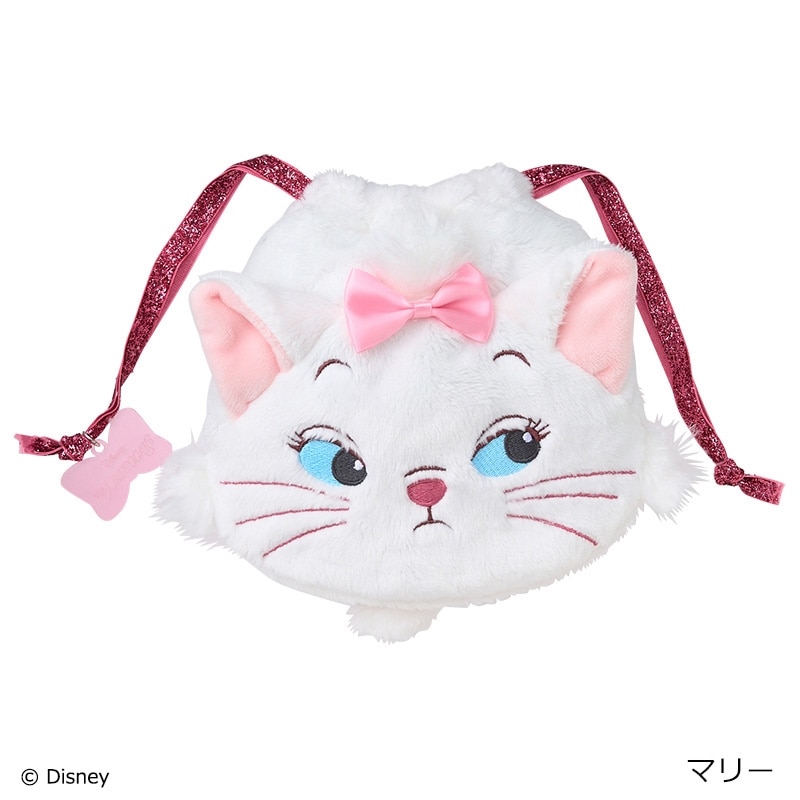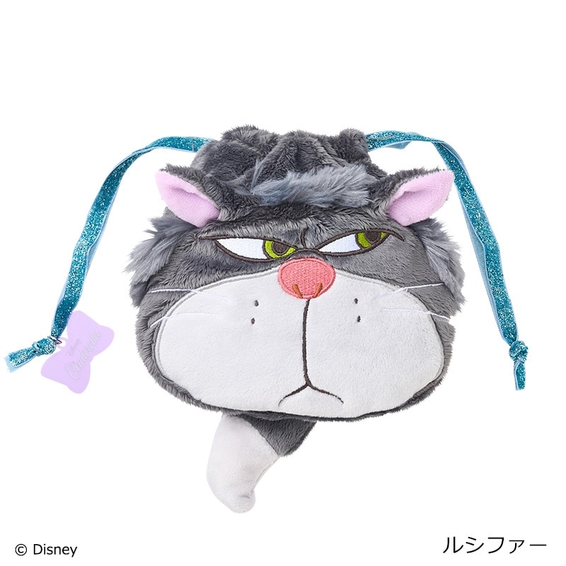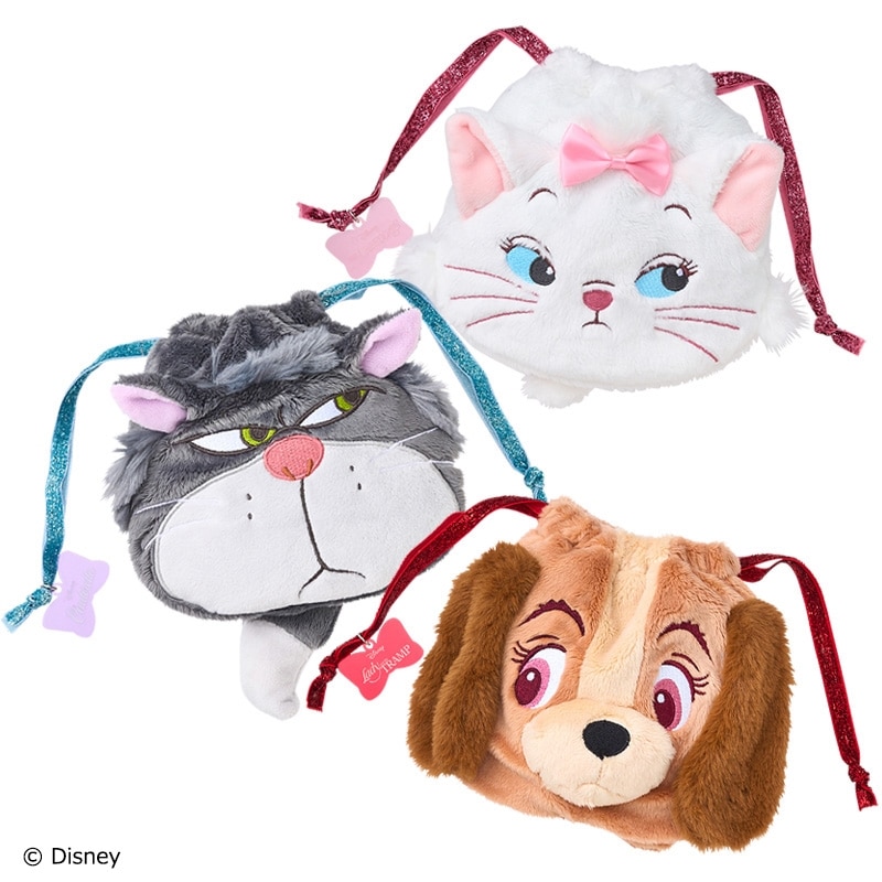 PLAZA限定!「おしゃれキャット」マリー、「わんわん物語」レディ、「シンデレラ」ルシファーの巾着ポーチです。小物をいれて口をきゅっと絞れば、丸くなってぬいぐるみみたいになるキュートなアイテム。ちょっと不機嫌そうなお顔もポイントです♪キラキラのリボンにはチャームもついています。