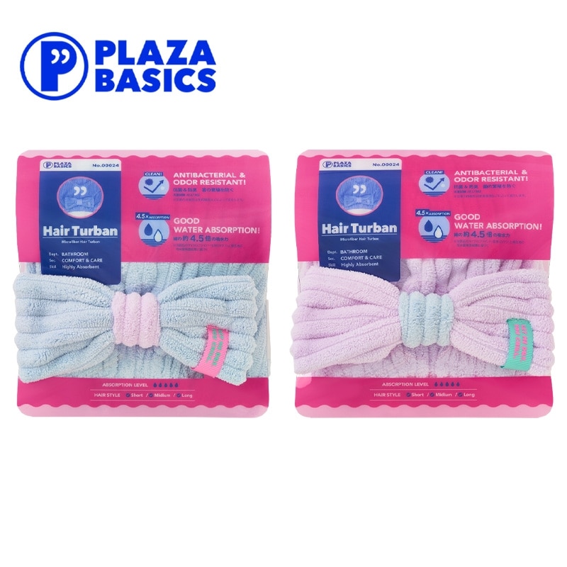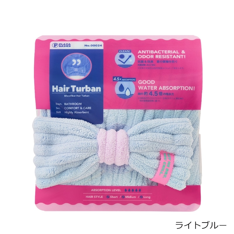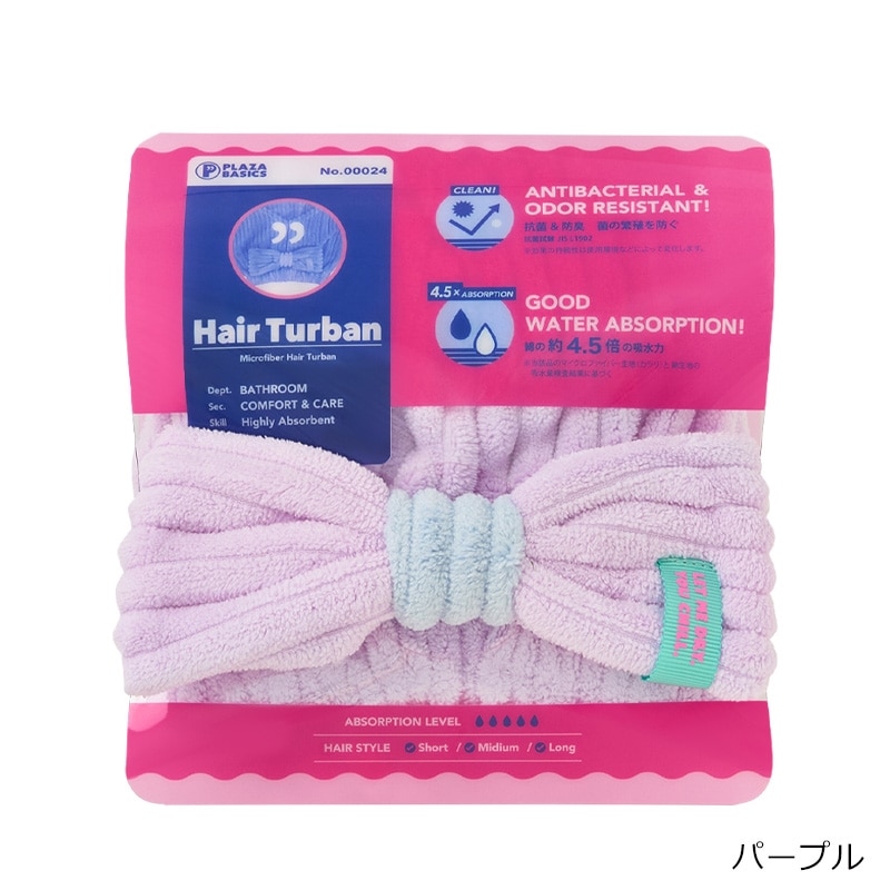 PLAZA限定!吸水性抜群、マイクロファイバー生地のヘアターバン。水分を素早く吸収しドライヤーの時間を短縮、髪へのダメージを軽減します。リブ編みのような立体感のある肌触りで、ずっと触ってたくなっちゃいます♪洗濯後もすぐに乾く便利なアイテムです。