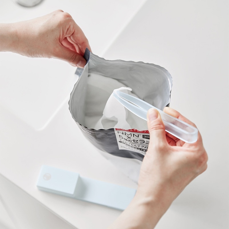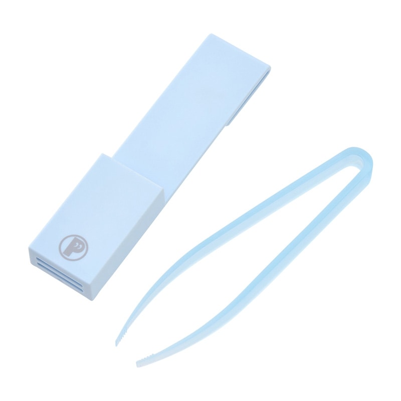 フェイスマスクを衛生的に取り出せるホルダー付きトングです。ホルダーをつまんでフェイスマスクの袋を閉じることも可能。