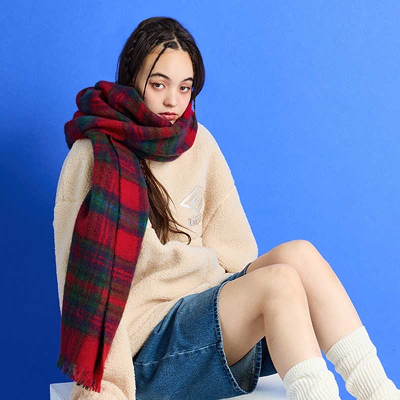 PLAZA限定!王道のチェック柄で、制服や通勤コーデをきれいめな印象に。華奢な印象のフリンジも上品で、優等生風の小物使いが楽しめるストールです。ふんわりタッチが見た目にもあたたかなブークレー素材は、厚すぎないのにしっかりあたたかいのが魅力です。