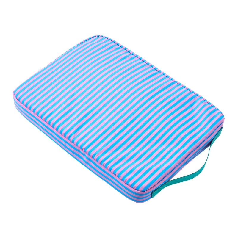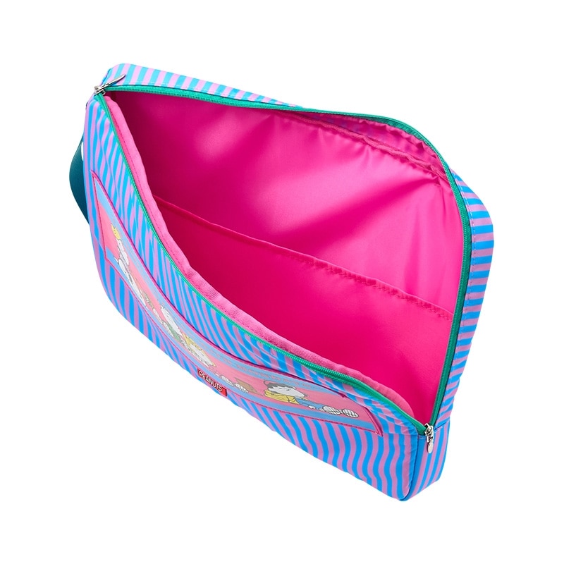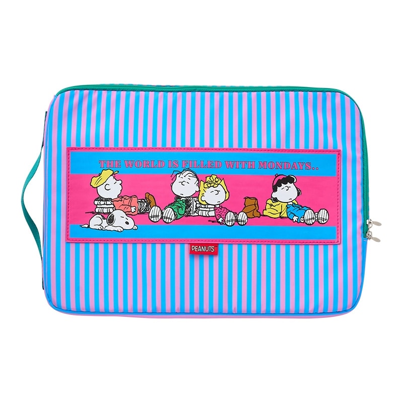 PLAZA限定!カラフルなストライプの柄がキュートなスヌーピーのLサイズのガジェットケース。パソコンやタブレット、A4サイズの書類や学校のテキストを入れるのにぴったりなアイテムです。持ち手が付いているので持ち運びも便利です。