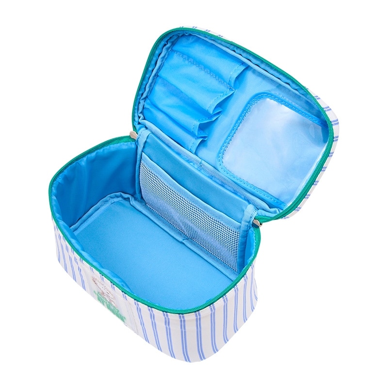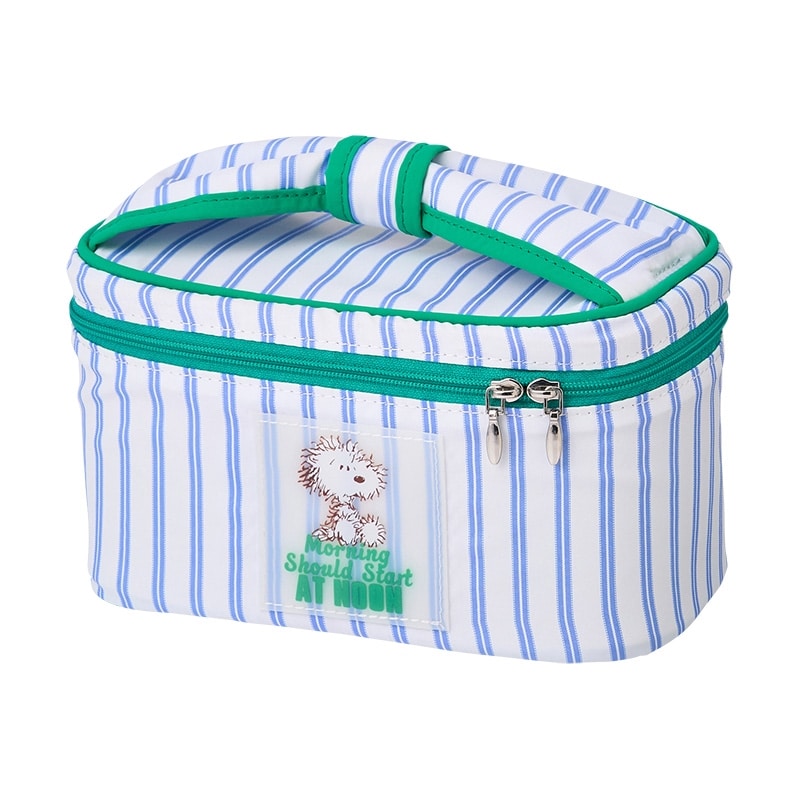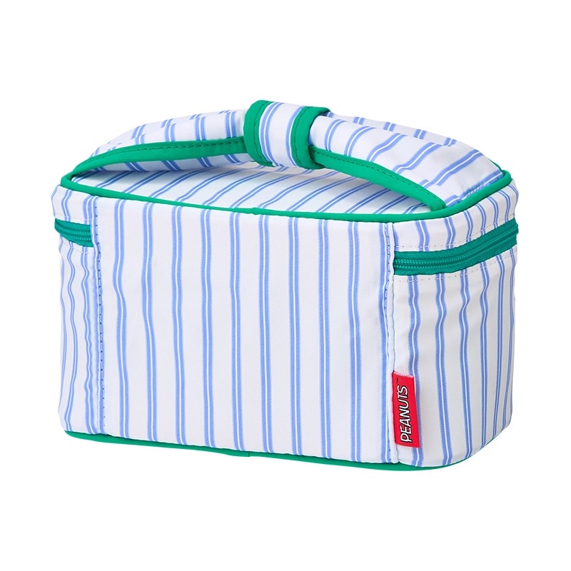 PLAZA限定!さわやかなストライプ柄がかわいいPEANUTSのバニティポーチ。正面のミニポケットに加えて、ブラシホルダーなども付いているので、コスメやスキンケアグッズをまとめて入れるのに便利なアイテムです。
