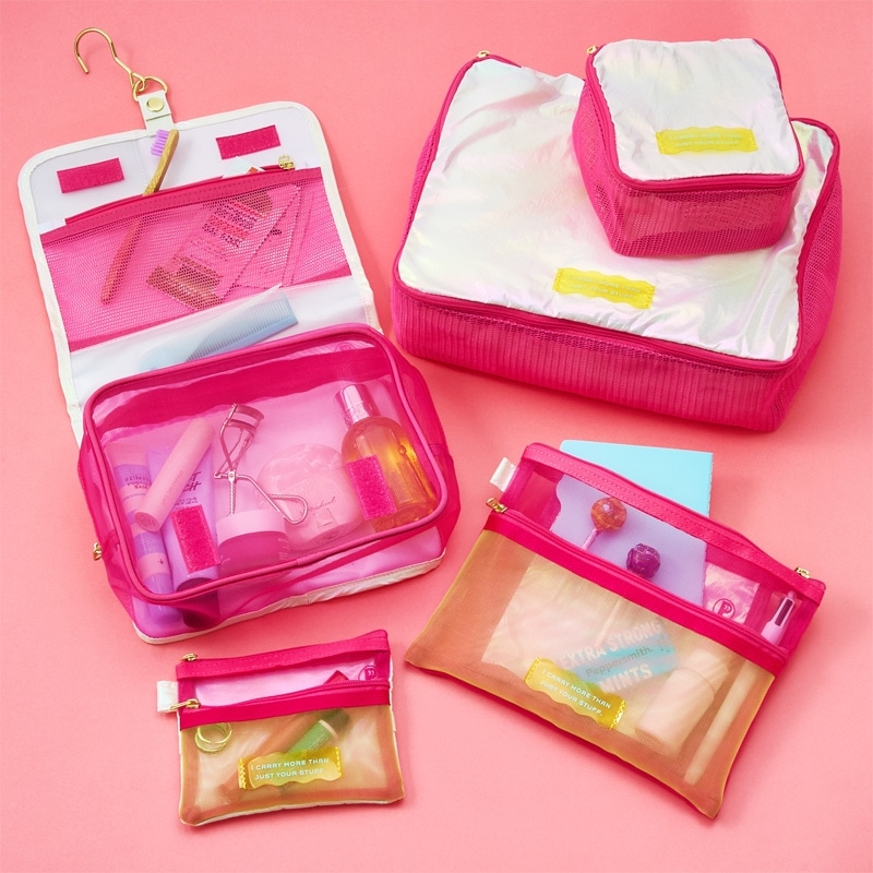PLAZA限定の雑貨シリーズ「PLAZA BASICS」のトラベルグッズ。ホワイトのオーロラ生地と濃いピンクのメッシュ生地の組み合わせがかわいい、フック付きハンギングポーチです。吊り下げられるフック付きなので、洗面所やクローゼットなど、使いたい場所に簡単に掛けられてとっても便利。用途に合わせて使い分けができる3つのポケットがあり、コスメや小物の整理にぴったりです。旅行先や自宅でのメイクタイムが楽しくなる、機能性とデザイン性を兼ね備えたアイテムです。