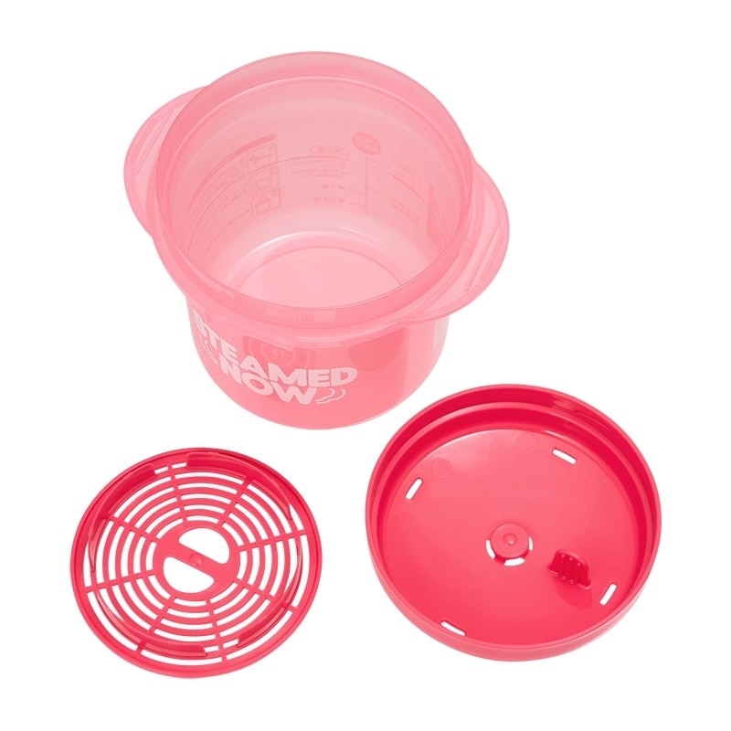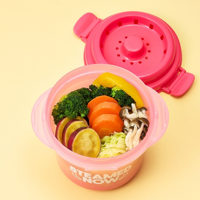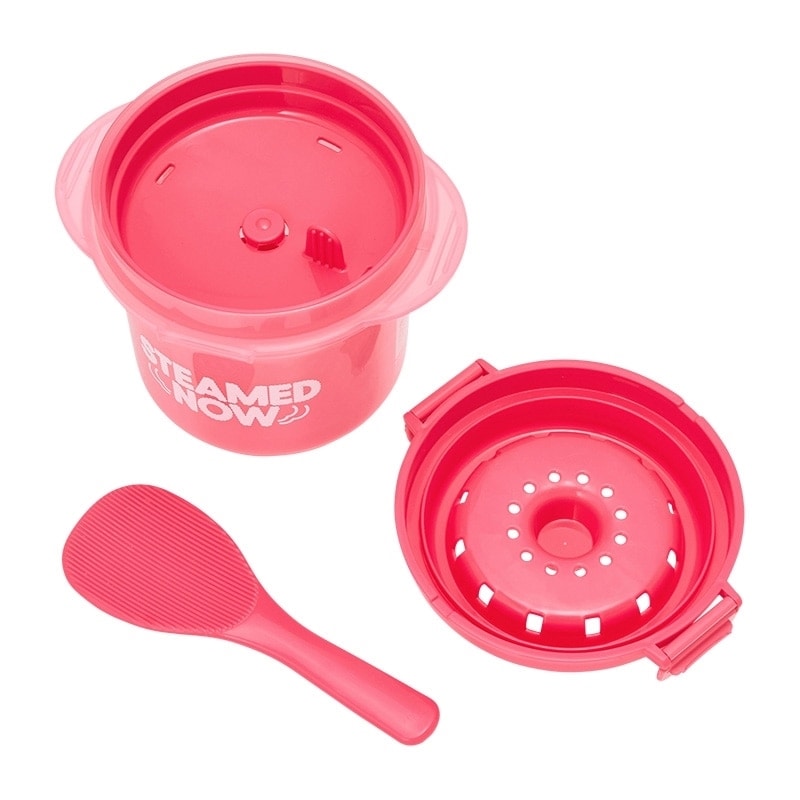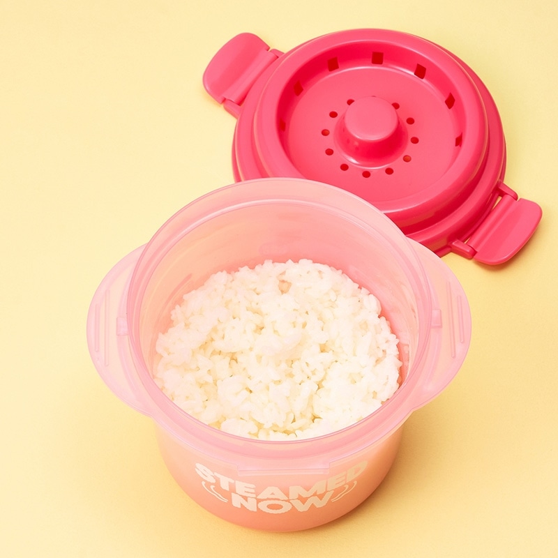 ほかほかごはんが少ない量で炊ける電子レンジライスクッカー。くっつかない加工のミニしゃもじ付きで、お弁当用や夜食用に少しだけ炊きたい時に便利です。付属のすのこを使えば、中華まんや野菜の蒸し料理も◎