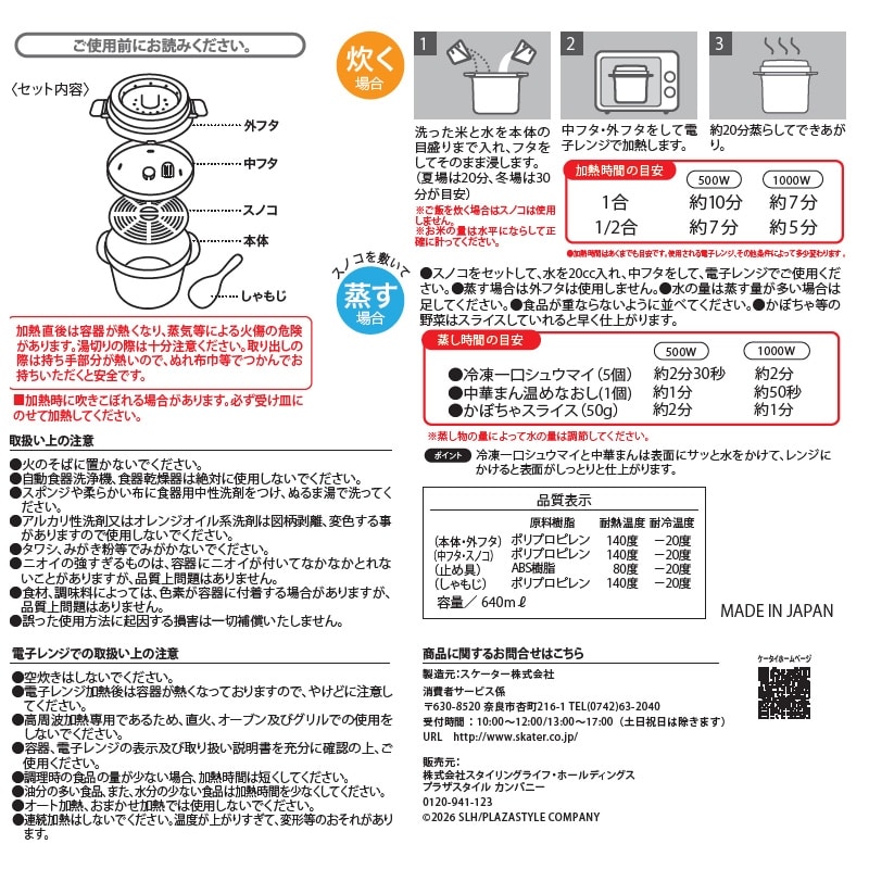 【素材】本体・中フタ・外フタ・スノコ・しゃもじ:ポリプロピレン