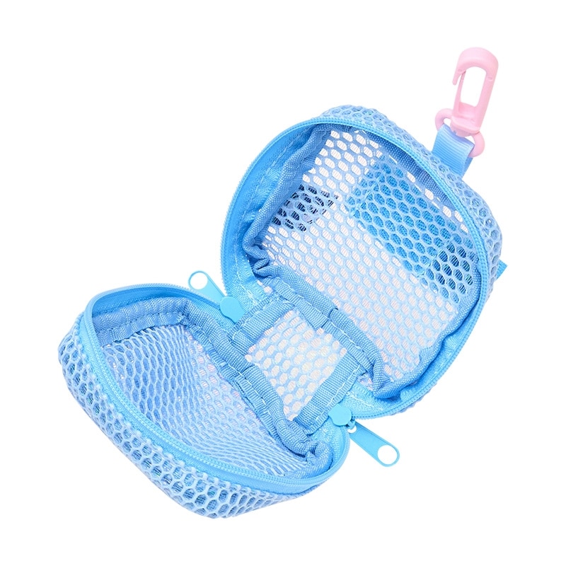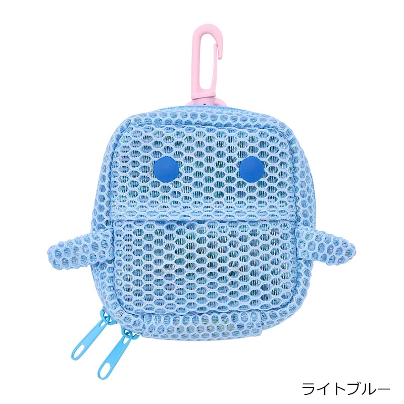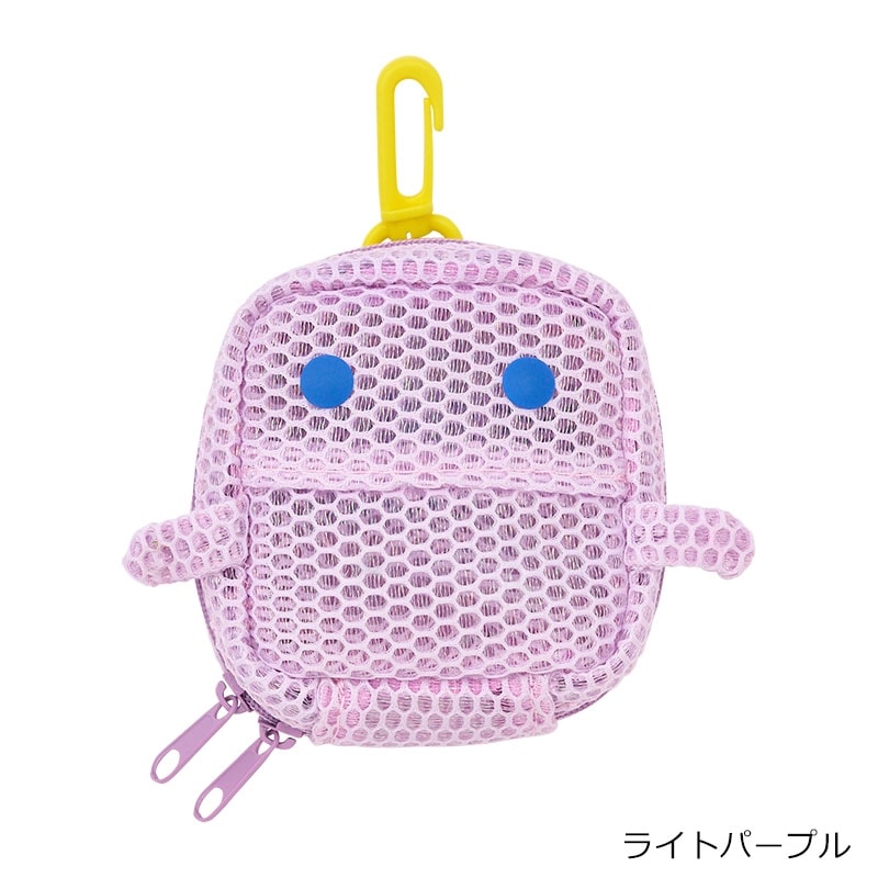スナップボタンの目がかわいい、カラビナでランドリーバッグなどに付けるのにおすすめなミニメッシュポーチです。