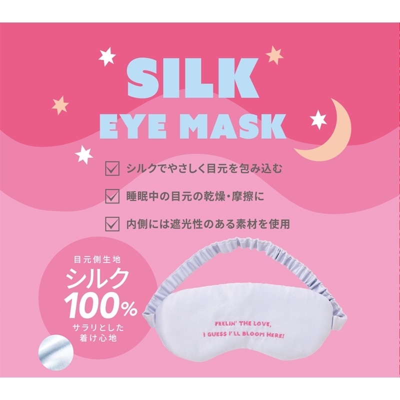 シルク100%のサラリとした付け心地で、やさしく目元を包み込むアイマスクです。内側には遮光性のある素材を使用しています。睡眠中の摩擦や乾燥から守ってくれます。