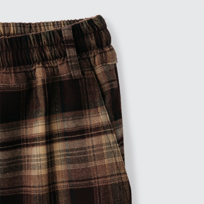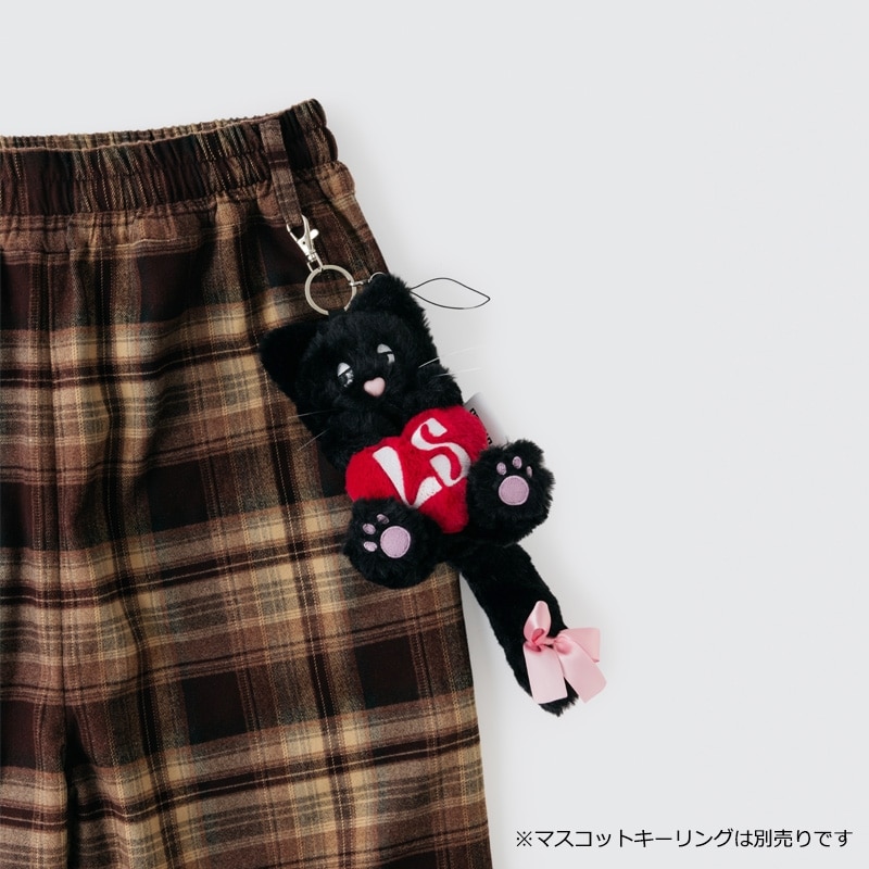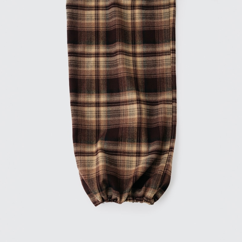 ロング丈でワイドシルエットのチェックパンツ。丈が長めなので、おうち時間にゆったり履くのも、ウエストを一折してジャストサイズで履くのもおすすめです。ウエストを折っても、折り目やシルエットが綺麗に見えるようこだわりました。裾にはドローコードが付いているので、裾丈の調整がしやすい仕様に。マスコットを付けられるベルトループと、スマートフォンが入るサイズのポケットが付いている、機能性も抜群のアイテムです。