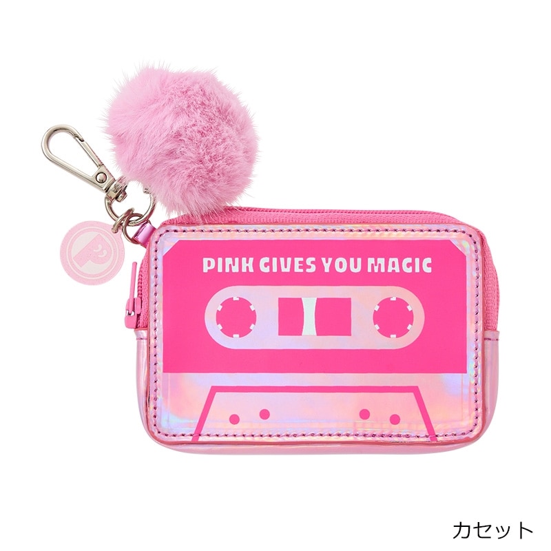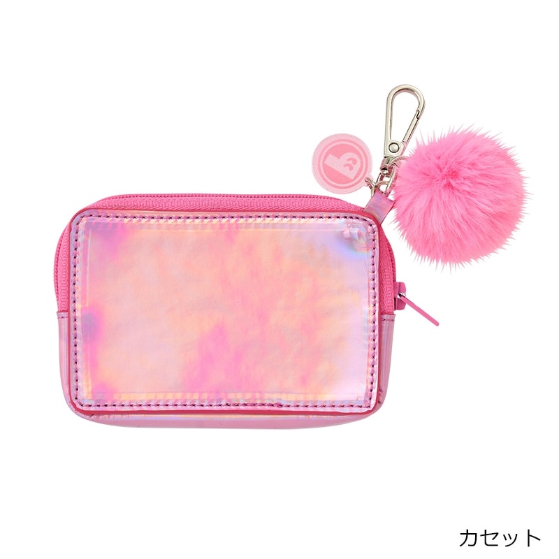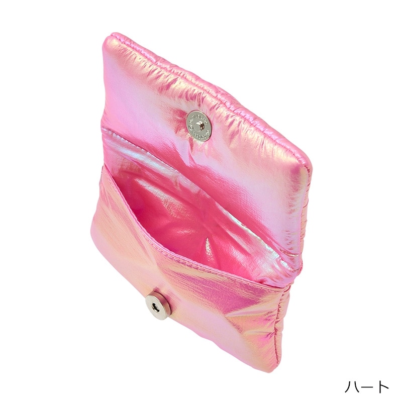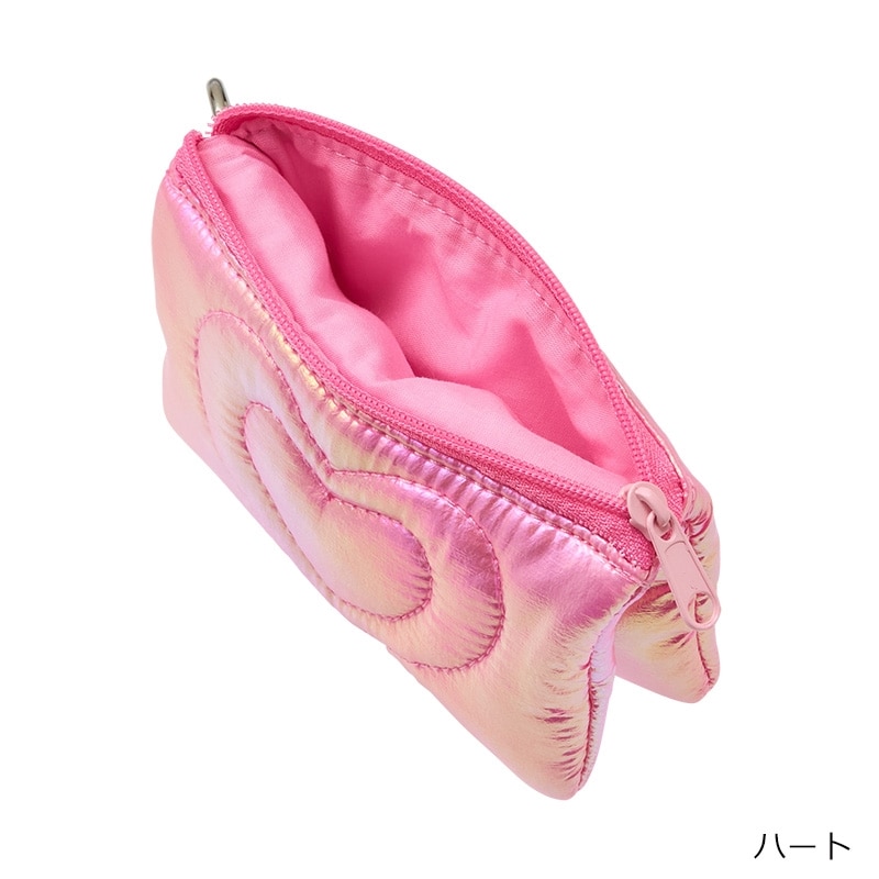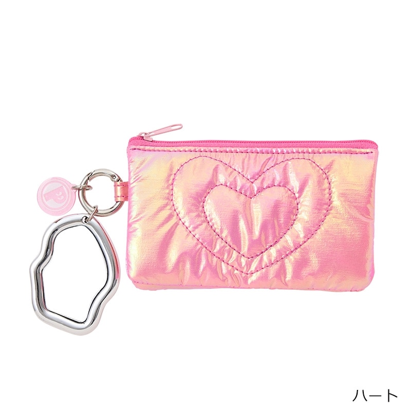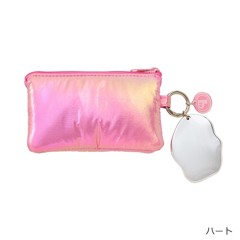 ピンクのメタリック生地が可愛いチャームポーチです。リップやイヤホン、鍵などの小物を収納するのにちょうどいいサイズ感。カラビナ付きなのでカバンに簡単に取り付けられ、持ち運びにも便利です。ハートのポーチはミニミラーチャーム付き。
