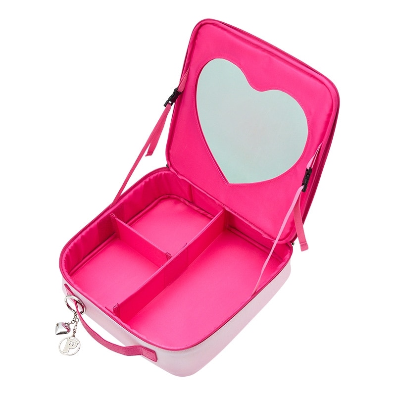 コスメをまとめて整理できる、仕切り付きのバニティポーチ。大きく開く蓋の内側にはハート型のミラーがついているのでドレッサーとしても使用できて、旅行先での持ち運びにも便利です。光沢感のある素材がかわいいアイテムです♪